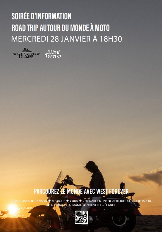 Vous avez des projets d’évasion ? Vous voulez parcourir les routes du monde en moto ? Venez découvrir les voyages spécifiques 2 roues proposés par West Forever le mercredi 28 janvier dès 18h30 chez HARLEY-DAVIDSON LAUSANNE !